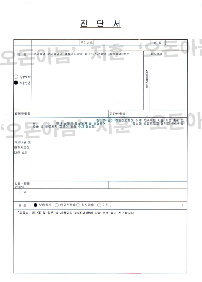기존 고객의 경우 RA 신고의무 초과시 대비하되, RA가 신고의무에 해당되더라도 승인을 받을 수 있습니다. 류마티스관절염도 발병할 수 있지만 예외가 있는데, 질병이 너무 심해 면역억제제를 인수할 수 없는 경우에는 간단한 보험에 가입해야 한다. 단순 암보험이라도 3개월 이내 입원 이력이 있는 경우 추가 검진(재검진)이 불가피해 가입이 불가능하다. 3개월 대기가 쉽지 않다면 간이보험 가입 => 3개월 기다리지 않고 가입할 수 있는 암보험 괜찮아요 면역억제제 복용하면 => 3개월 후 필요 간단하게 준비하세요 3개월 이내 입원 이력이 없다는 전제하에 보험가입 3개월까지 기다리기 힘든 경우 => 3개월 고지의무가 필요 없는 간이보험에 상품등록이 가능합니다. 문의하시기 바랍니다. 문의사항은 아래 링크를 클릭해주세요. 오픈카톡 문의 : https://open.kakao.com/o /swHBlywd 전화상담 SMS상담 010-2566-9890