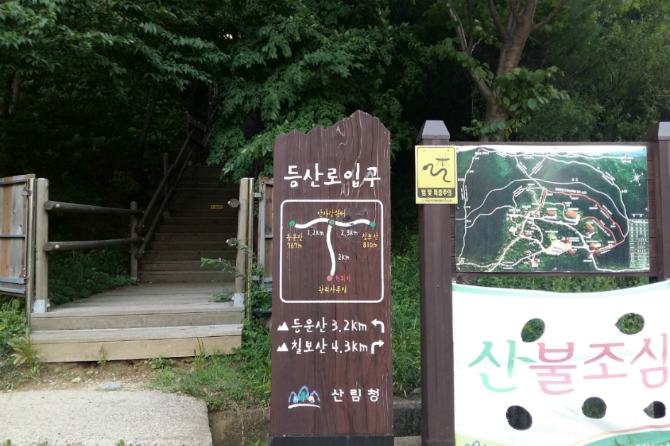 행정실 옆에는 몇 년 전에 다녀온 등운산과 칠보산 등산로가 있습니다.