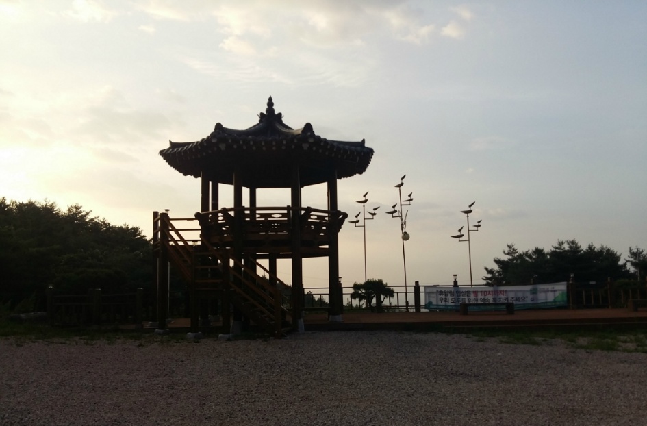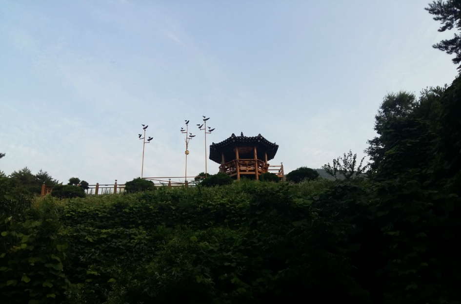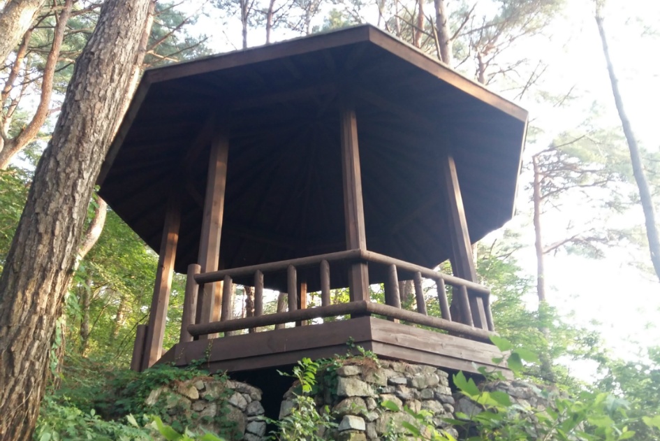휴양림 정자는 솟대와 함께 아침해를 마주하고 있다.