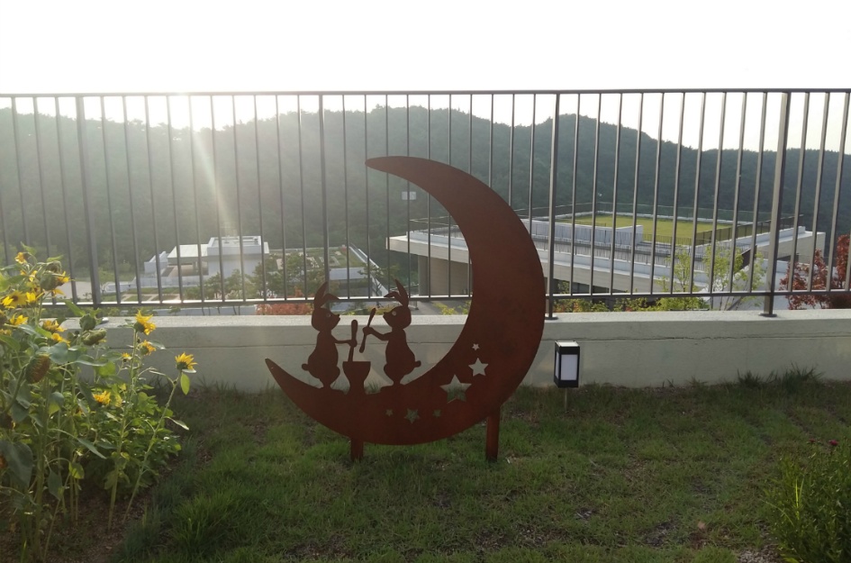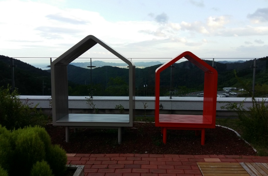 나눔동 주변 잔디밭… 학 모양의 종이비행기 의자. 비움동의 객실은 모두 바다를 향하도록 설계되었고, 산을 향한 숙박시설은 없는 것으로 나타났다.