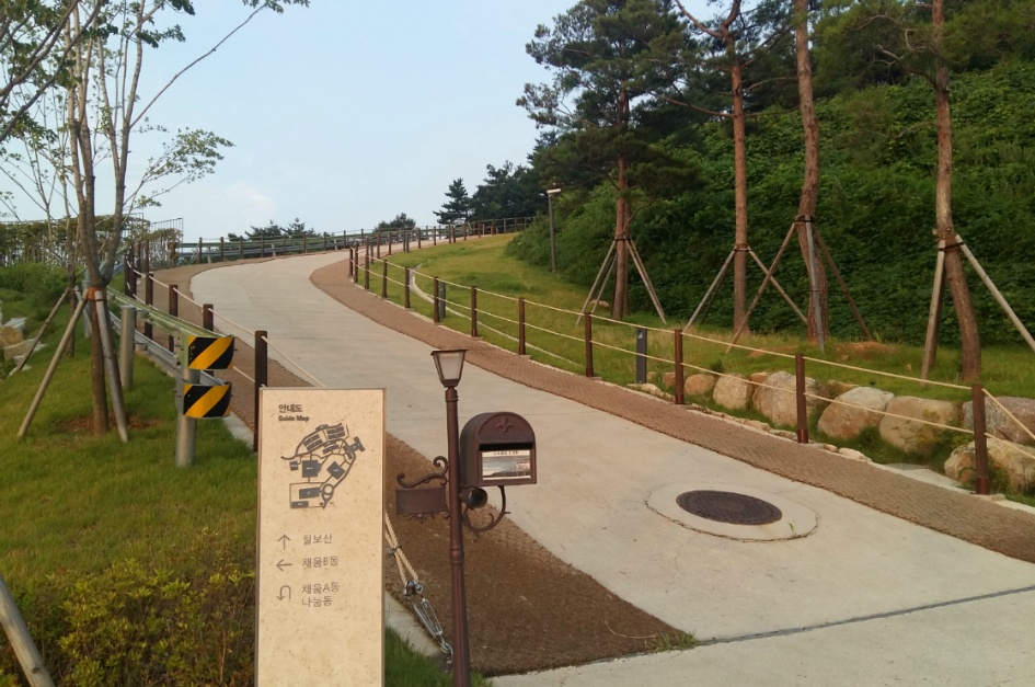 칠보산 휴양림까지 도보 30분 후 숙소로 복귀합니다. 각 건물은 산 중턱을 따라 지어져 있어 전방 시야가 방해받지 않습니다.