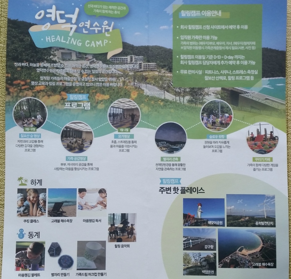방에 돌아와 쉬다가 방에 들어와서 받은 팸플릿을 봤다. 힐링캠프 프로그램이 있다.