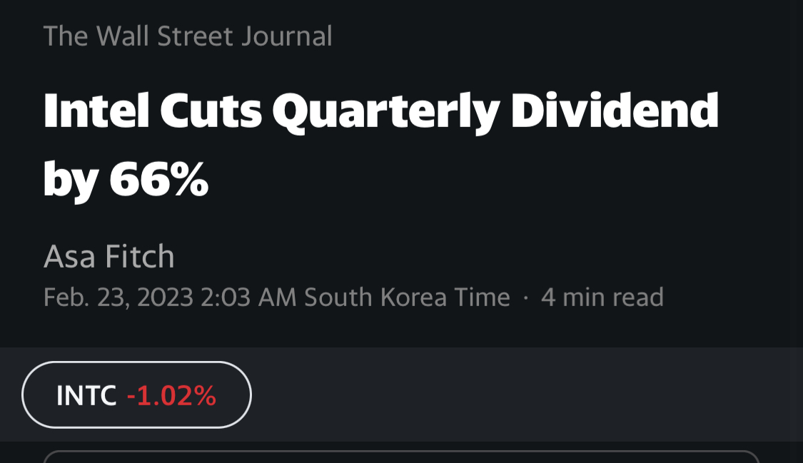 인텔은 분기 배당금을 주당 36.5센트에서 12.5센트로 삭감한다고 발표했습니다.
