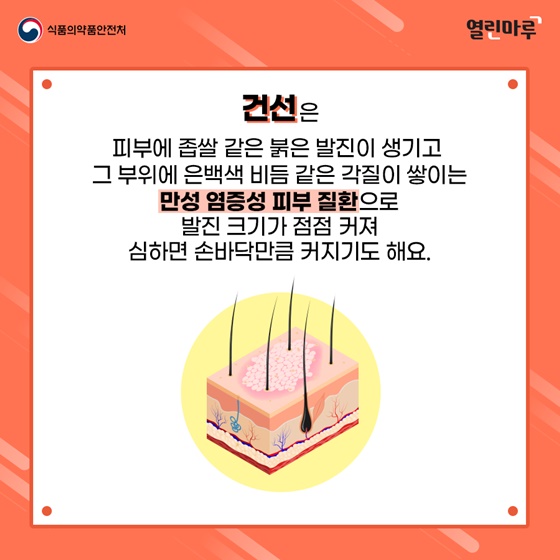 사실 판상건선처럼 질환 인지도가 높지 않은 경우 일시적인 현상이라고 생각하고 쌓인 각질을 인위적으로 제거해 보습을 충분히 해주시는 등 자가 관리를 시도하다가 내원하시는 분들이 많습니다.많은 분들이 시도하시는 각질 제거와는 반대로 건선 관리 중에 가장 중요한 부분은 은색 각질을 잘 보존하는 것입니다.인설을 충분히 저장하지 못하고 제거해 버리면 이미 과잉 생산되고 있는 각질이 더 빨리, 더 많이 만들어지게 되어 오히려 질환을 악화시킬 수 있습니다.또 건선은 병변에 자극이 있는 경우 그 부위에 새로운 건선이 생기는 경향이 있어 피부 자극이 적은 샴푸나 샤워 제품을 사용해 보습을 충분히 해 각질세포가 잘 떨어지지 않도록 하는 것이 중요합니다. 자연스러운 피부 호전 미소로 면역치료미세로 한의학적 판상건선 치료의 목적은 환자에게서 위험인자를 발견하고 이에 대해 적절한 치료를 하는 것입니다. 이를 위해 항염증, 항산화, 면역 조절, 대사 기능 조절 작용이 있는 한약 치료를 실시합니다. 기존 건선치료제와 달리 한약은 장기복용에 대한 우려가 적어 만성피부질환을 치료하는데 안전하며 황금, 황련, 포공영, 작약, 지환, 청대 등 GMP인증 천연 한약재만을 사용하여 환자의 체질과 증상에 따라 필요한 약제를 가감합니다.특히 청색띠는 T세포의 건선 유발 메커니즘에 직접 관여하는 IL-17을 억제하는 효과가 있어 한약뿐만 아니라 건선 증상 완화를 위한 외용제 개발에도 주요 성분 중 하나로 많이 사용되고 있습니다. 병변의 양상에 따라 작용하는 광선 치료치료 전인 2022년 03월 29일 치료 후 2022년 11월 21일 광선치료란 말 그대로 자외선 파장을 이용해 피부질환 호전에 도움이 되는 치료로 판상건선에도 좋은 작용을 하는 것으로 알려져 있습니다.실제로 햇빛이 약한 북유럽은 따뜻하고 습한 동남아에 비해 건선 유병률이 높다는 연구가 있습니다. 햇빛을 받으면 자연스럽게 피부 건강을 높일 수 있는 효과가 있으며, 홍반의 경우 자외선 B 파장을 이용하면 그 예후가 좋습니다.치료에 사용되는 광선의 종류는 자외선 B, 자외선 A, 가시광선이 있으며 사용되는 주파수와 적용 방법에 따라 그 효과가 다르기 때문에 피부질환 양상에 따라 유연하게 적용하고 있습니다.환부에 외부 자극이 심하게 작용할 경우 해당 부위에 질환이 추가로 발생하는 건선의 특성상 광선 치료는 외부 자극을 최소화한 상태에서 가장 긍정적인 치료 효과를 얻을 수 있다고 할 수 있습니다.판상건선은 특히 만성·재발성 환우분들이 많아 치료가 어렵다는 인식이 있습니다. 믿을 수 있는 곳에서 자신의 몸을 꼼꼼히 살피고 설계한 치료를 꾸준히 받으면 치료가 어렵다는 생각이 달라질 것입니다.믿고 찾아주시는 만큼 웃는 얼굴로는 자신 있고 객관적인 치료로 답합니다.감사합니다。더운 날씨에 민감해진 피부에는 웃는 얼굴로 한의원의 간편한 진료예약 카카오톡으로 문의하세요.피부치료과정 바로가기 치료전후 바로가기더운 날씨에 민감해진 피부에는 웃는 얼굴로 한의원의 간편한 진료예약 카카오톡으로 문의하세요.피부치료과정 바로가기 치료전후 바로가기더운 날씨에 민감해진 피부에는 웃는 얼굴로 한의원의 간편한 진료예약 카카오톡으로 문의하세요.피부치료과정 바로가기 치료전후 바로가기