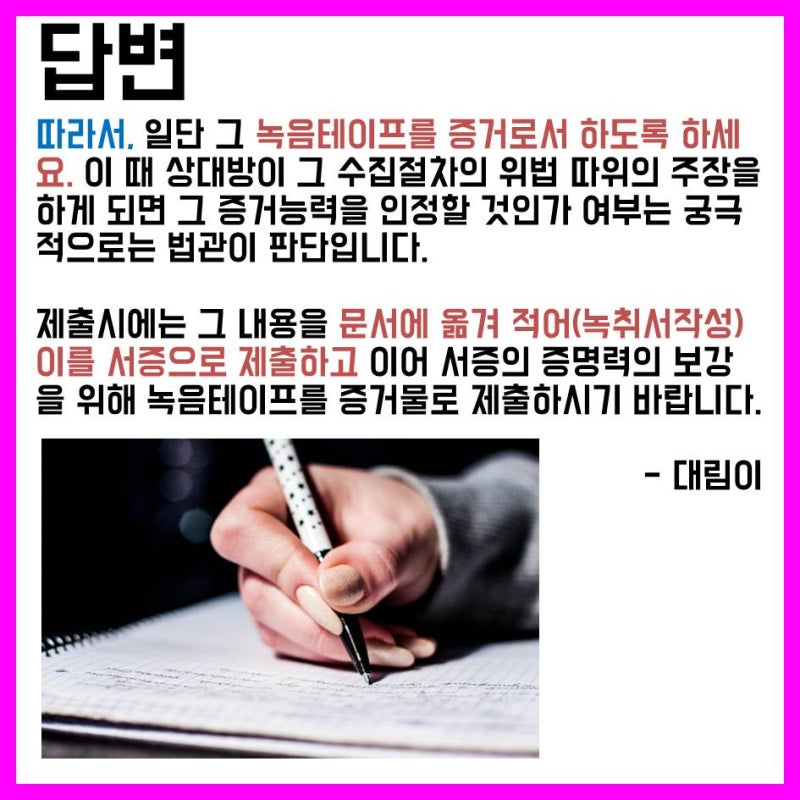 보통 상담을 하다보면 성적증명서에 대해 아주 우수한 증빙을 해주는 경우를 많이 보게 됩니다. 이제 성적표를 받았으니 상대방의 거짓말을 폭로할 수 있다 무조건 이겼다고 하는데 반드시 그런 것은 아니다. 녹취록이나 녹취록이 형사소송에서 증거로 채택되기 위해서는 매우 난해한 증거가 있어야 합니다.