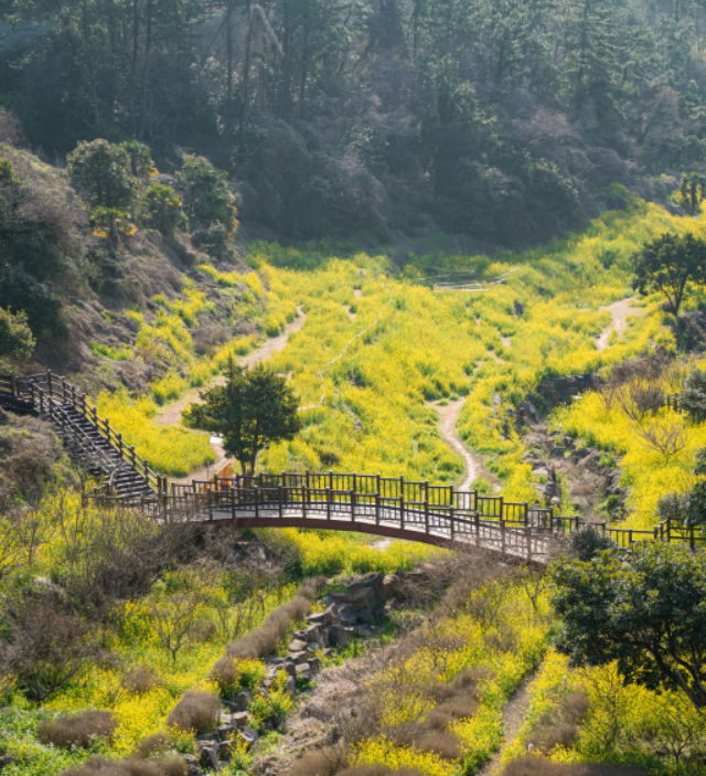 유채 꽃밭이 계곡에 자리 잡고 있습니다. 헝덩물계곡은 큰 바위와 험준한 지형으로 물을 찾는 동물들도 엉덩이를 집어넣고 심부름을 하고 돌아갔다고 해서 붙여진 이름이다. 굴곡진 땅에 산발적으로 피는 유채꽃은 제주의 가로로 펼쳐진 유채꽃 명소와는 또 다른 입체적인 풍경을 연출한다. 일부 유채 꽃은 사람보다 키가 크고 “꽃의 벽”이 세워진 것과 같습니다. 나무 아치형 다리를 건너 계단을 올라 전망대에 오르면 유채꽃이 만발한 흥덩물계곡을 한눈에 조망할 수 있다.