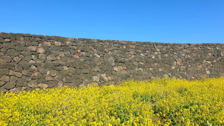돌담성에 숨어있는 유채꽃밭. 제주다움을 물씬 풍기는 유채꽃 명소. 내려다볼 수 있을 만큼 높은 성곽이 꽃밭을 보호하듯 둘러싸고 있다. 불규칙한 크기의 돌로 지어진 성의 정상에 오르면 한쪽으로는 하도리 바다가, 다른 한쪽으로는 마을의 고요한 시골과 유채꽃밭이 펼쳐진다. 오름이 아닌 것이 오름과 같은 배경을 제공한다는 사실에 감사하다. 특히 성 위를 걷는 모습은 푸른 하늘이 사방을 덮고 있어 감성적인 분위기를 자아낸다.